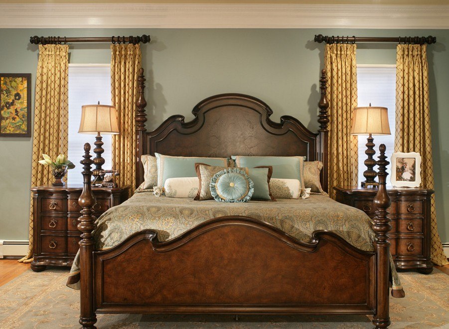 Спальня – это комната для отдыха, поэтому в ней всегда царит уютная и расслабляющая атмосфера. Хотя дизайн кантри отличается простотой, мебель в комнате должна быть массивной и удобной