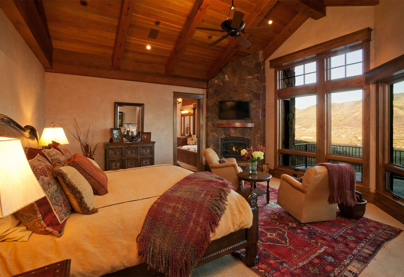 Даже скромную по площади спальню можно оснастить камином. Нередко под спальню в загородном доме отводят помещение на верхних этажах или размещают на мансарде, но даже в таких случаях в маленькой комнате можно организовать каменный очаг.