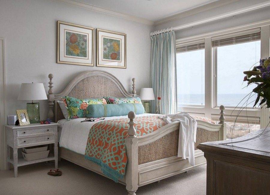 3. Текстиль. Предпочтительны натуральные ткани. Мебельная обивка, постельное белье, занавески, покрывала должны быть однотонными или с цветочным принтом. Контрастных или насыщенных расцветок не подразумевается. Актуальна морская тематика, сельские пейзажи.