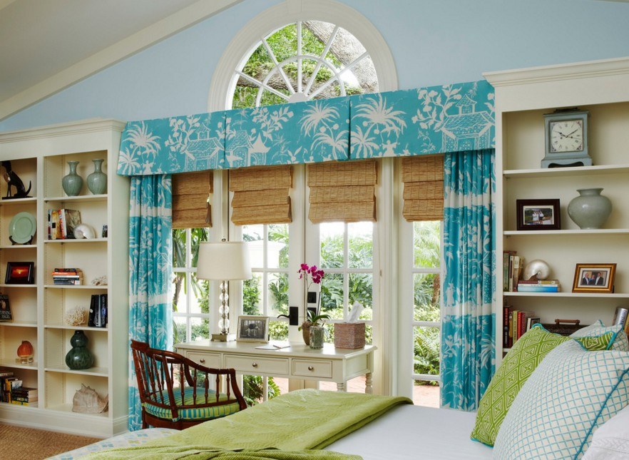 Длина штор подбирается индивидуально. Летом популярно использование укороченных продуктов. Допустимо наличие простого рисунка ламбрекена, особенно при оформлении гостиной-спальни в стиле кантри.