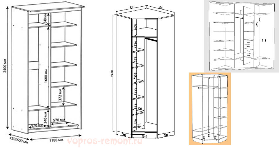 Угловую гардеробную правильнее выполнить в виде параллелепипеда с одним срезанным углом. Чертеж такой представлен на рис. в центре. По зрительному восприятию она уже не выпирает, а наоборот, как бы вдавливается в угол. По вместимости же оказывается равнозначной треугольной вдвое большего размера, если считать по стене.