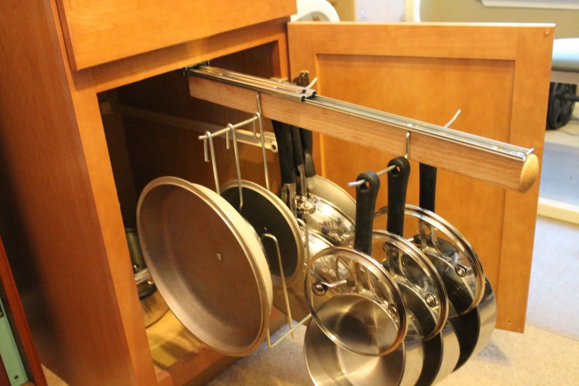 Современные конструкции кухонных шкафов разработаны со встроенными выдвижными вертикальными панелями, в которые крепятся кастрюли и даже крышки.