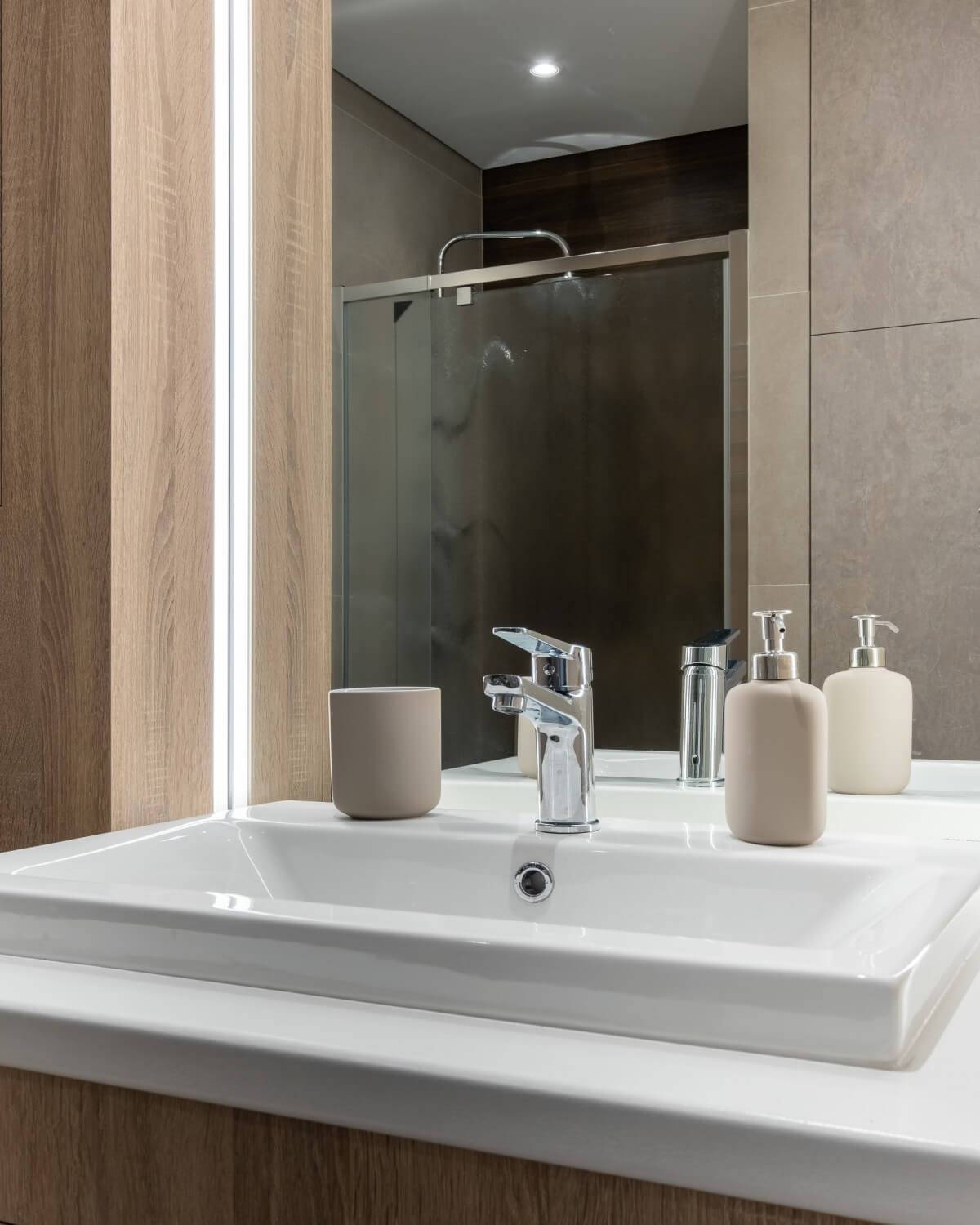 Вертикальные зеркала, в свою очередь, заставляют низкий потолок перестать быть проблемой! В ванной комнате такого типа также стоит отказаться от массивных рам — определенно лучшим решением будет простое безрамное зеркало. Такие зеркала умело подчеркивают современный характер просторной ванной комнаты.