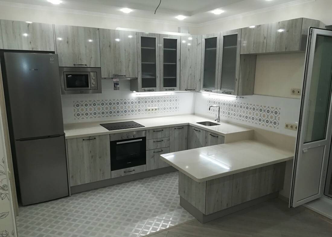 Подходит для малых и средних помещений, превосходно используя имеющееся пространство. Возможность расположить мойку, холодильник и плиту по принципу треугольника, для оптимизации доступа. Удобное зонирование, компактность и вместительность делают этот вариант наиболее популярным.