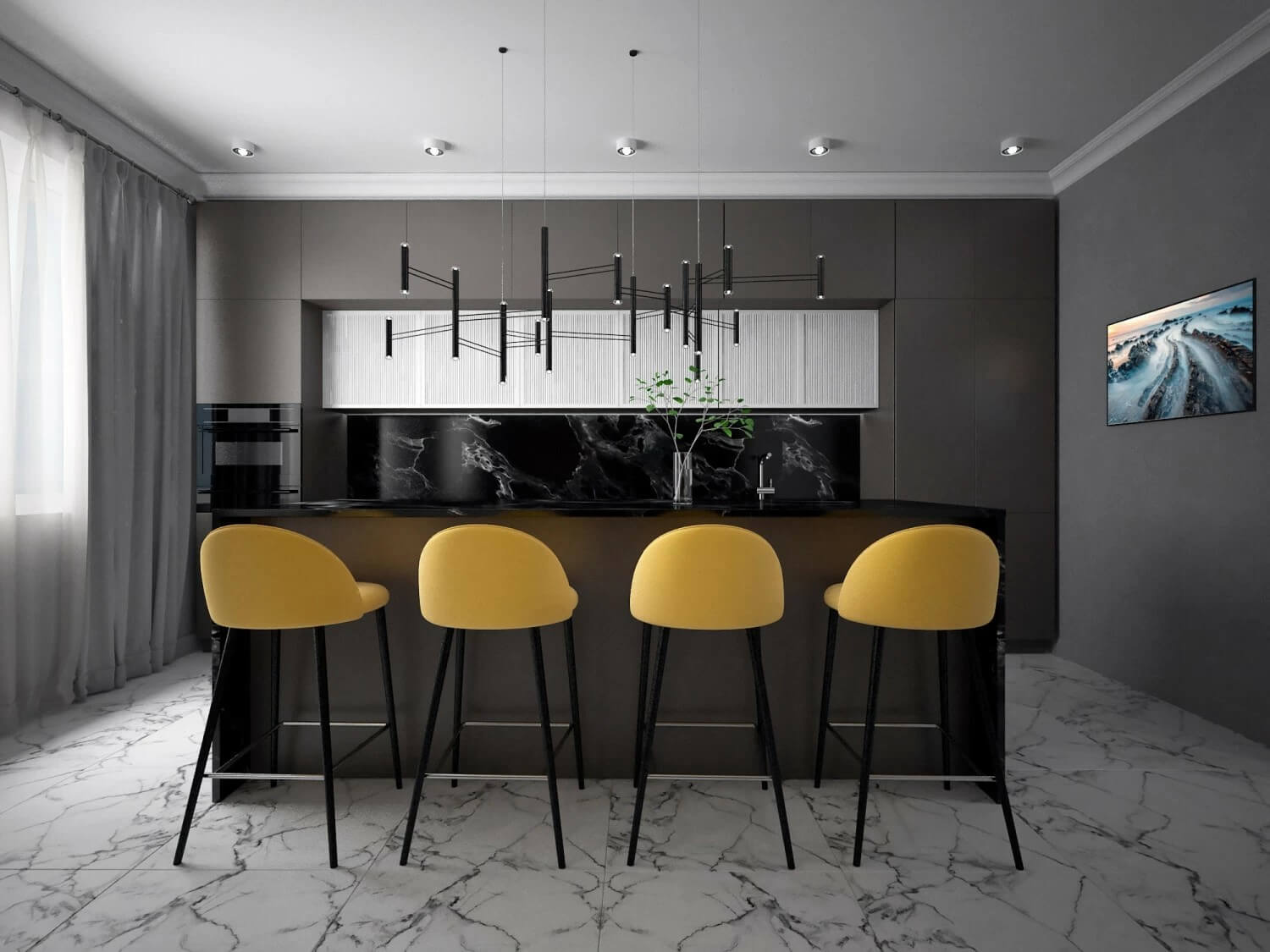 В интерьере этой кухни не так много цвета — преобладают базовые серый, чёрный и коричневый. Оптимизма добавляет ярко-жёлтая обивка барных стульев и картина на стене — пейзаж в голубых тонах. Проект квартиры «Сила ветра», дизайнер Виталия Романовская