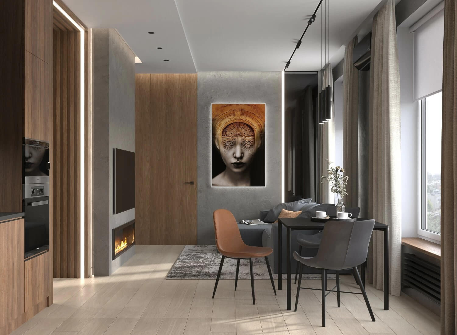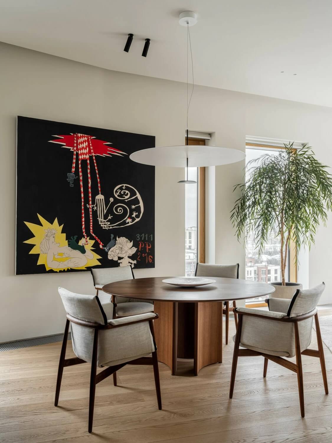 Сдержанный интерьер в тёмных тонах мог бы показаться слишком формальным, если бы не интересный декор. Стиль этой картины можно определить как «мистический реализм» — она сразу приковывает взгляд. Проект квартиры в ЖК «Ривер Парк», дизайнер Елена Бандукова
