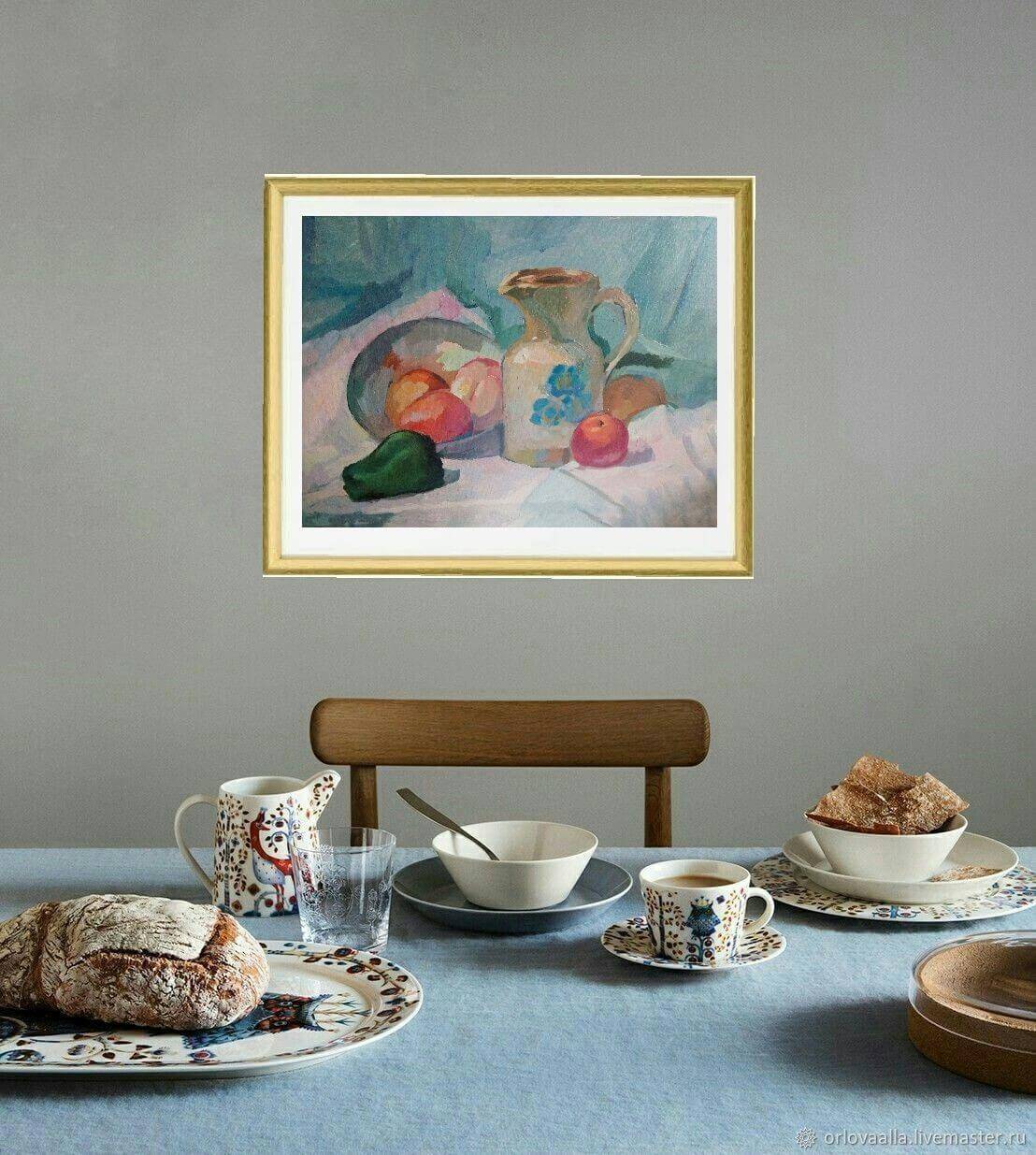 Яркий натюрморт на стене и дизайнерская посуда на столе: идеальная обстановка для греющей душу трапезы. Livemaster