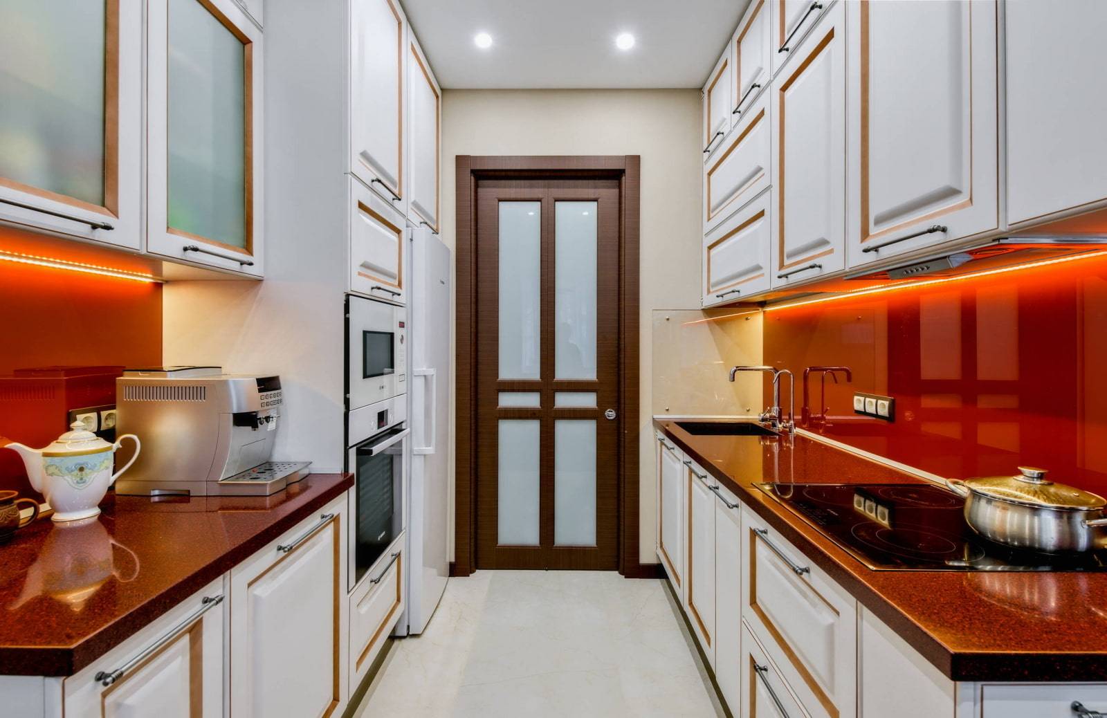 Лучшая альтернатива для комнаты прямоугольной формы. Расстановка предметов интерьера выполняется с двух противоположных сторон. Основной плюс в компактном расположении. Удобство рабочей поверхности и наличие множества свободного места для хранения утвари.