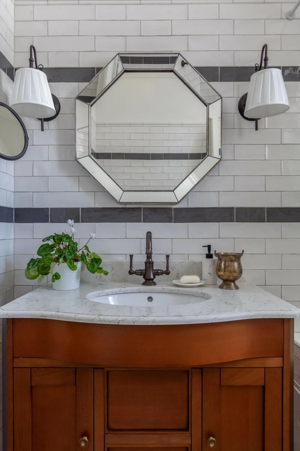 Если у вас было одно зеркало, теперь повесьте два, только не друг напротив друга. А старое обязательно меняем, да так, чтобы по форме и обрамлению оно было кардинально другим. И если раньше в ванной висело овальное зеркало без рамы, то теперь пусть будет прямоугольное, в красивой деревянной раме. Этот простой приём прекрасно трансформирует помещение ванной комнаты.