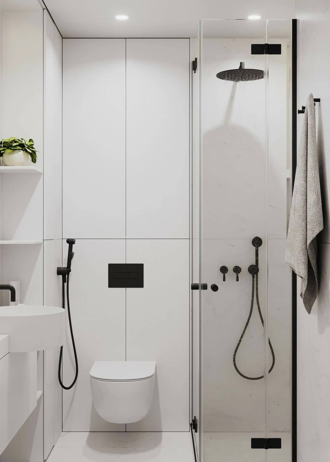 Даже небольшой горшочек с зеленью сразу преобразит монохромную ванную комнату— в ней станет теплее и уютнее. Проект квартиры в ЖК «Черная речка», дизайнер Артём Алексеев