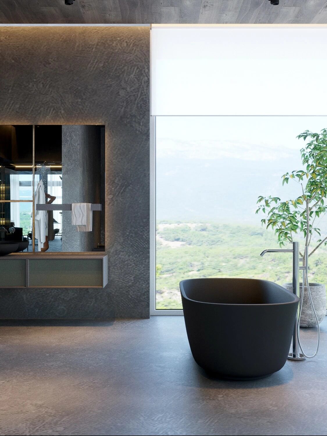 Ванная комната без труда станет главной релакс-зоной в доме, если в ней есть большое окно и живые растения. Проект дома в Турции, дизайнер Павел Алексеев