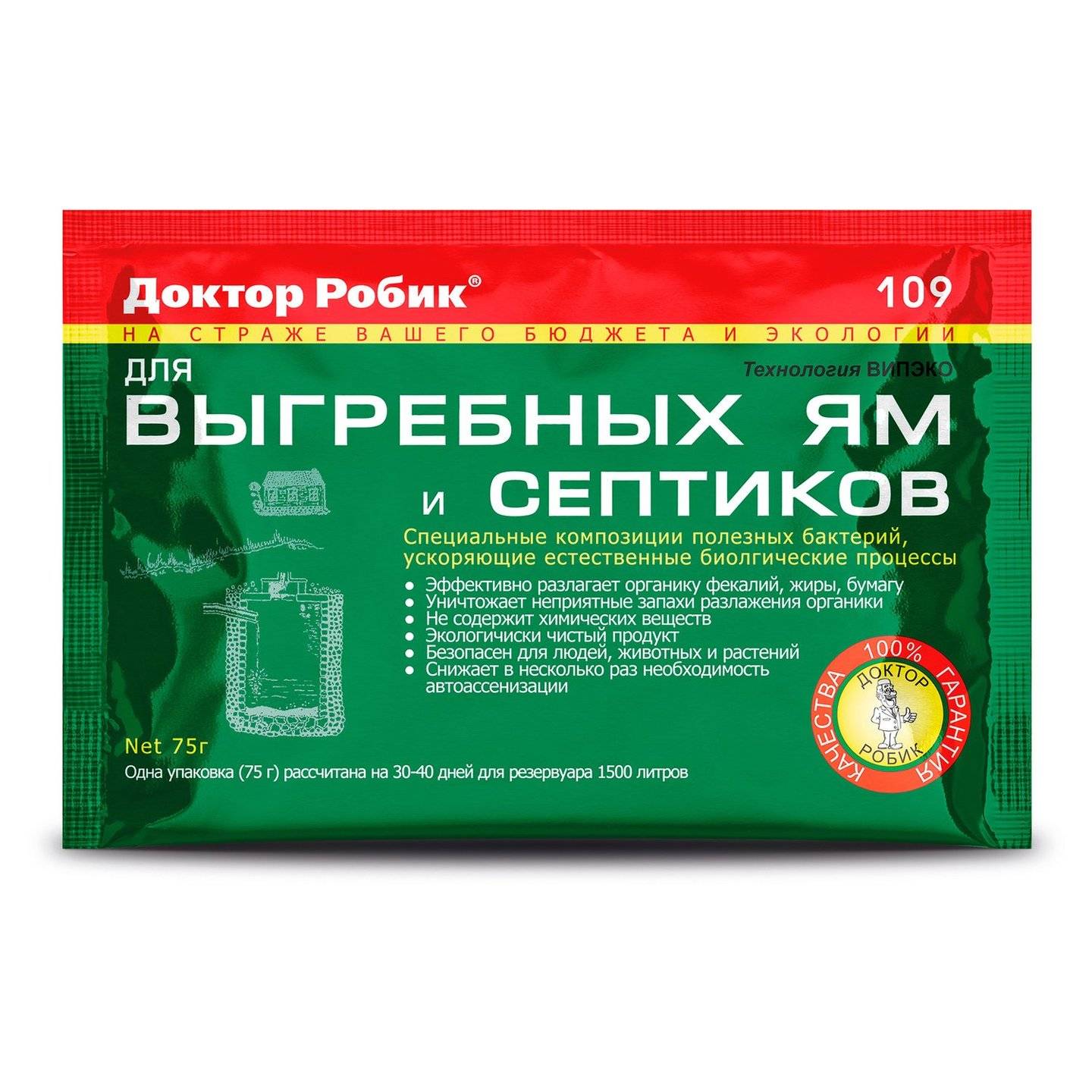 “Доктор Робик 109” – самый популярный продукт, который выпускает корпорация. Он предназначен для простых септических систем и выгребных ям. Один пакетик содержит 5% бактерий и 95% подкормки. Раз в месяц в септик необходимо высыпать один пакет средства.