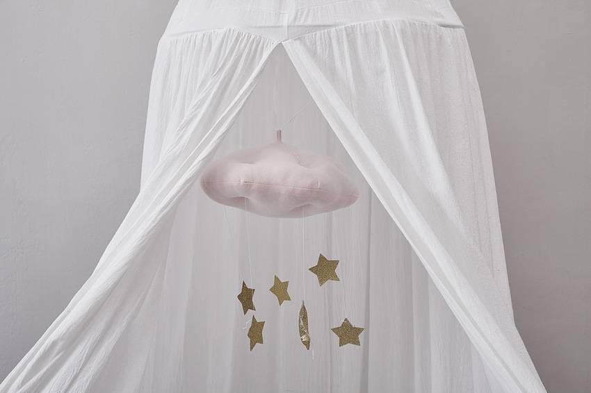 - Сетка. Такой балдахин устанавливается на кроватку летом, так как он способен обеспечить циркуляцию воздуха в пространстве. Это относительно бюджетный вариант, который, однако, не поможет защитить кровать от яркого солнца, ветра и частиц пыли.