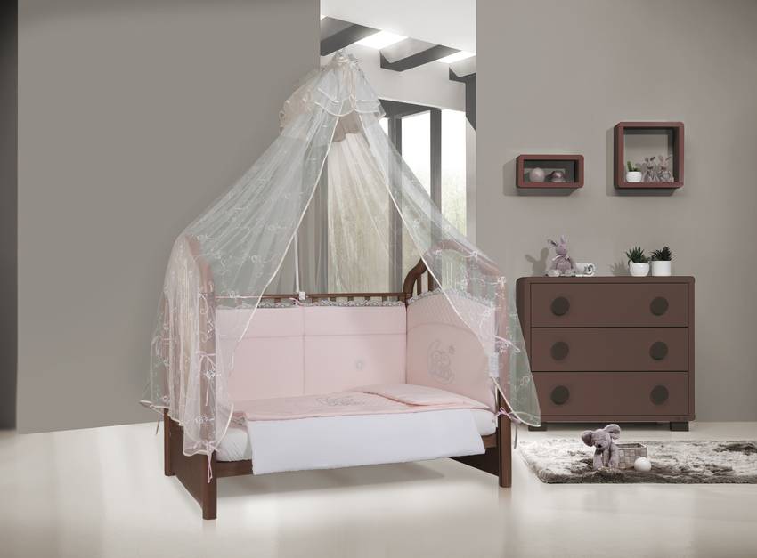 Мобильные крепления обладают универсальными свойствами, их легко монтировать, перемещать, менять высоту пологодержателя. Такой балдахин можно установить на кроватку трансформер. Сначала полог используют как защиту сна младенца. Позже, когда ребенок подрастает, балдахин становится декором для открытой кровати.