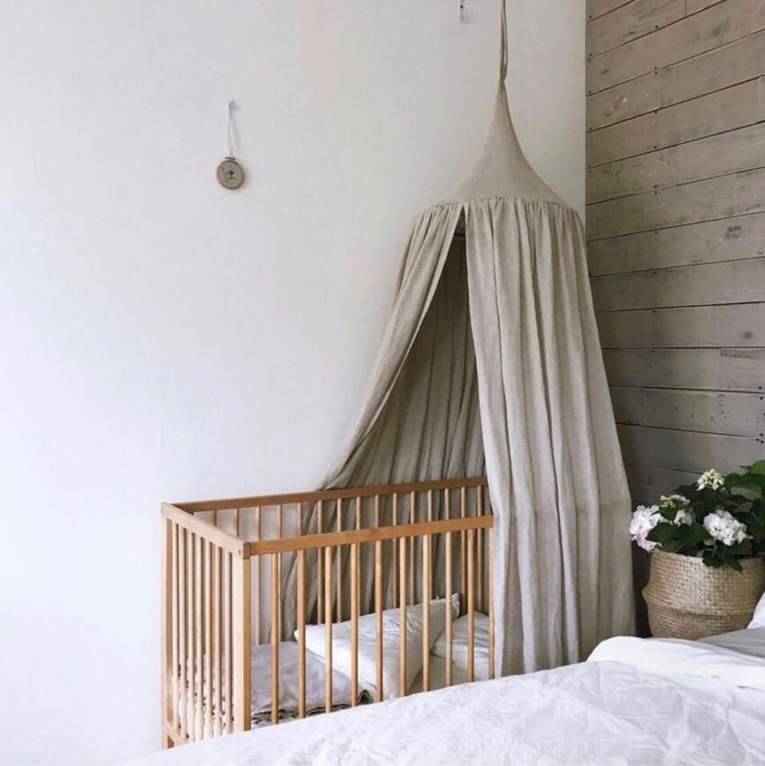 - Лен или хлопок. Эти натуральные ткани отличаются высокой плотностью, которая позволит сделать конструкцию более защищенной и изолированной. Балдахин из лена или хлопка хорошо справляется с защитой ребенка от действия солнца и пыли.