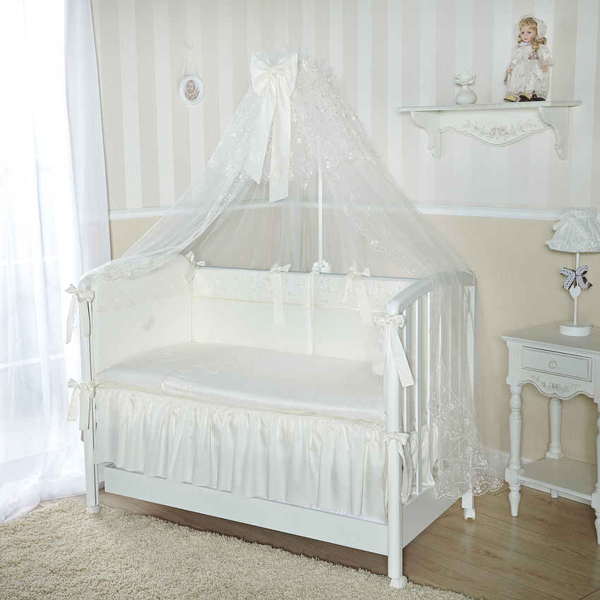 - текстиль — лучше выбирать не сильно тяжелую, прозрачную ткань. Самый лучший выбор – органза или вуаль. Для детской кровати можно приобрести шелк, лен или ситец;