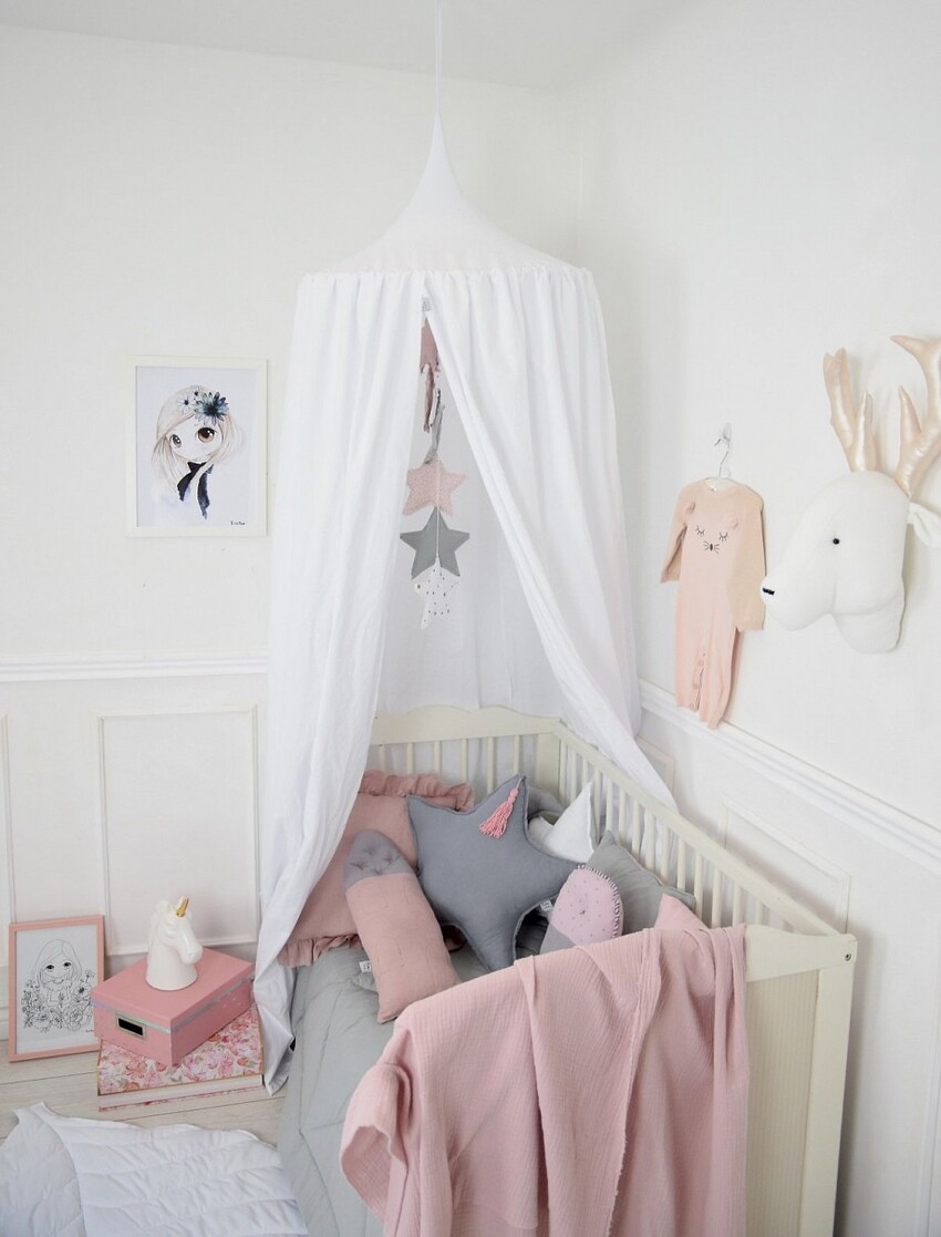 Основное правило, которое следует соблюдать — это качественный и надежный монтаж, ведь с каждым месяцем ребенок становится все активнее и любознательнее, легко может дернуть занавеску. Слетевший с креплений балдахин может испугать или даже травмировать ребенка.