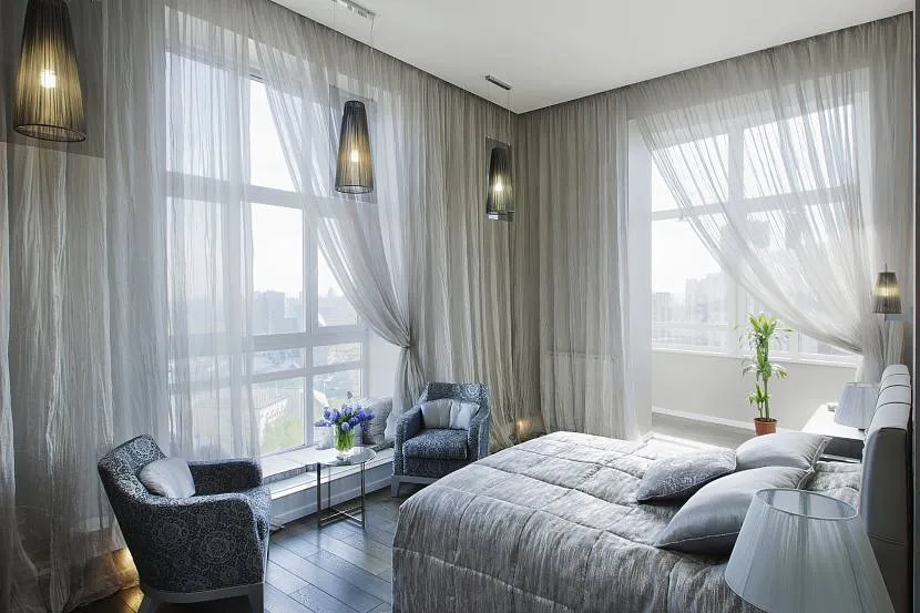 Подбор стиля при оформлении интерьера спальни шторами белого цвета