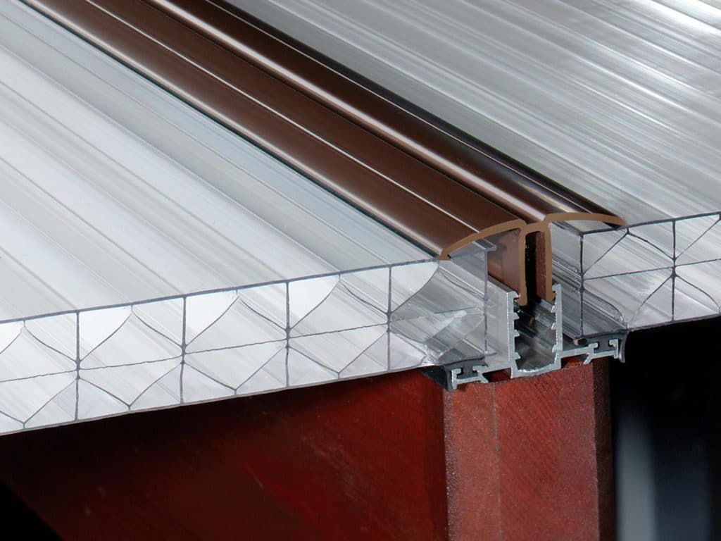 В первом случае (слева) листы фиксируются прижимными планками с ребристой снизу поверхностью, на которые надвигается защитно-декоративная планка. Во втором случае (справа) в качестве зажима работает изогнутая верхняя планка, а в дополнение есть подкладка снизу. Более удачным может оказаться другой тип соединительного профиля, полностью разборного. В качестве подкладки может выступать монолитный поликарбонат, любой другой пластик, тонкие деревянные планки. Сотовый поликарбонат использовать нельзя – он плохо работает на сжатие!