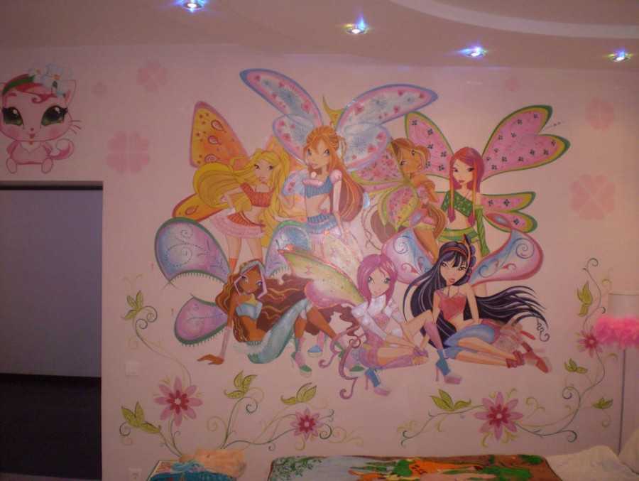 Дети любят все яркое, разноцветное, как из мультфильмов иди книжек. Поэтому отличным решением будет оформить стены изображениями любимых героев мультфильмов. Можно развесить картины, красиво оформленные, разместить яркие буквы в виде каких-либо слов, цветные стикеры.