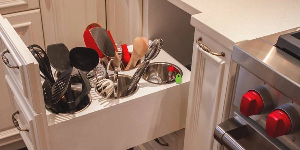 Ножи, вилки и прочие столовые приборы удобно хранить в специальных органайзерах. Убедитесь, что они не накапливают воду или тщательно вытирайте посуду: жидкость может заплесневеть, а металл потемнеть.