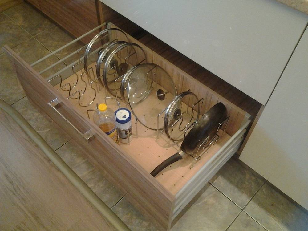 Также можно заказать специальный гарнитур с разделителями — он поможет разложить посуду по размерам и не путаться в ней. Легкий и удобный способ поддержать порядок, но довольно дорогостоящий. Альтернатива — сделать разделитель самому, используя металлическую сетку. Крышки удобно хранить в специальной сетке Блюм, которая цепляется на любую вертикальную поверхность.