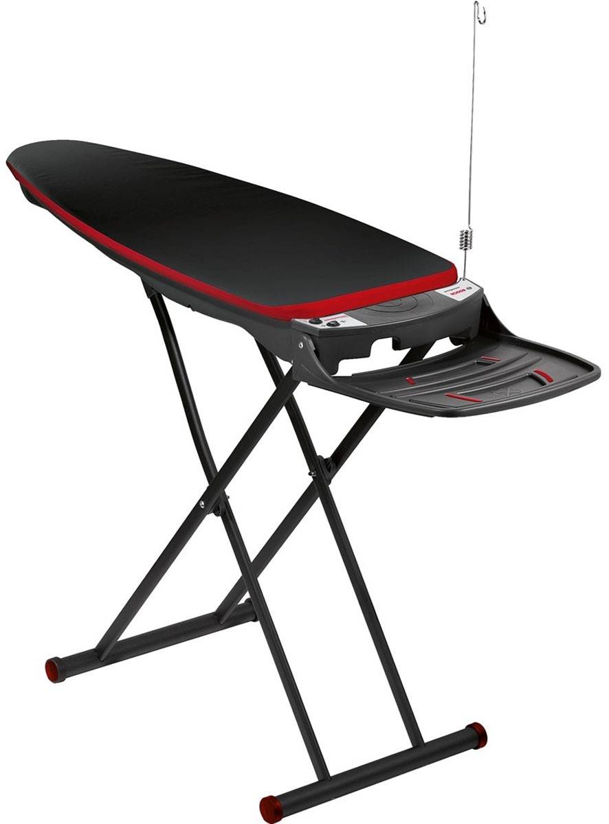 Модель с цельнометаллической столешницей размером 73:32 см имеет удобный выдвижной крючок, с помощью которого устройство можно подвешивать и хранить прямо в шкафу. Чехол выполнен из натурального хлопка, стальные ножки оснащены резиновыми фиксаторами.