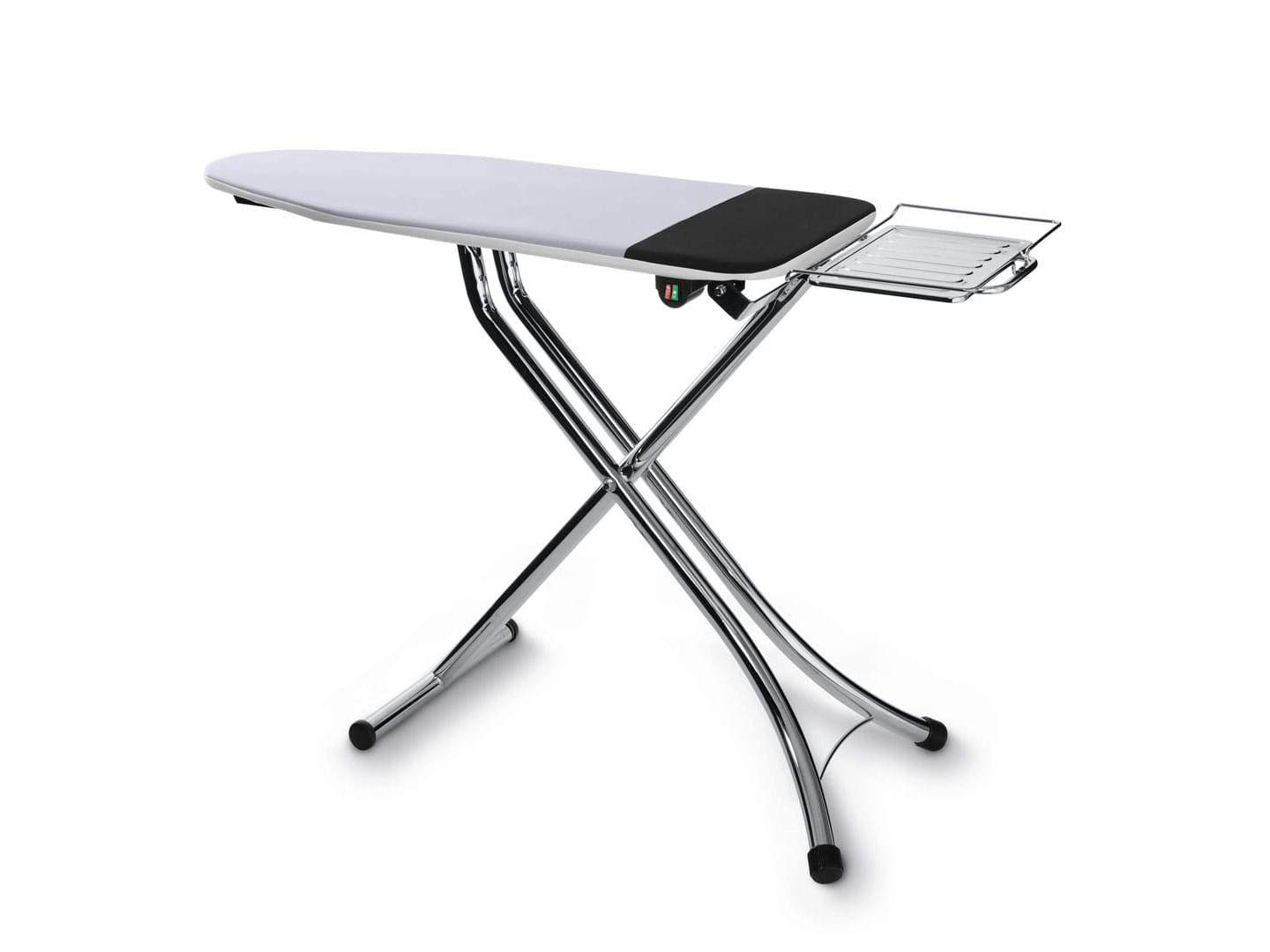 Цельнометаллическая конструкция с рабочей поверхностью размером 122:44 см и ножками EasyFix. Оснащена съемным чехлом, встроенной розеткой с длиной шнура 140 см, круглой металлической подставкой, на которой имеется силиконовая непригораемая фурнитура.