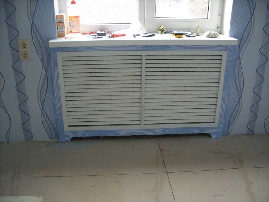 Первый вариант применяют, чтобы спрятать радиаторы, расположенные в нишах либо не закрытые сверху подоконником, и устанавливают прямо на батарею.