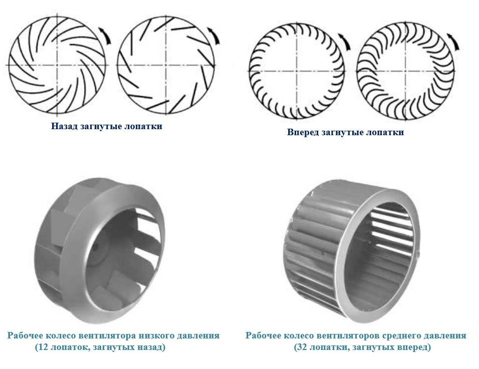 Как уже было сказано, основная особенность конструкции – улитка. Необходимо обозначить и форму лопаток. В вентиляторах этой марки применяют три их разновидности:
