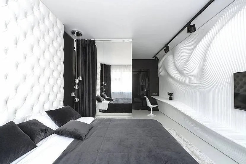 Чтобы черная спальня с белой мебелью не выглядела строгой, в интерьер включают серые нотки. Оттенок используют для переходов между тонами. Светлые фасады с пепельными вставками или рисунками смотрятся эффектно. Дизайнеры в монохромной комнате часто отдают предпочтение зеркальным дверцам.