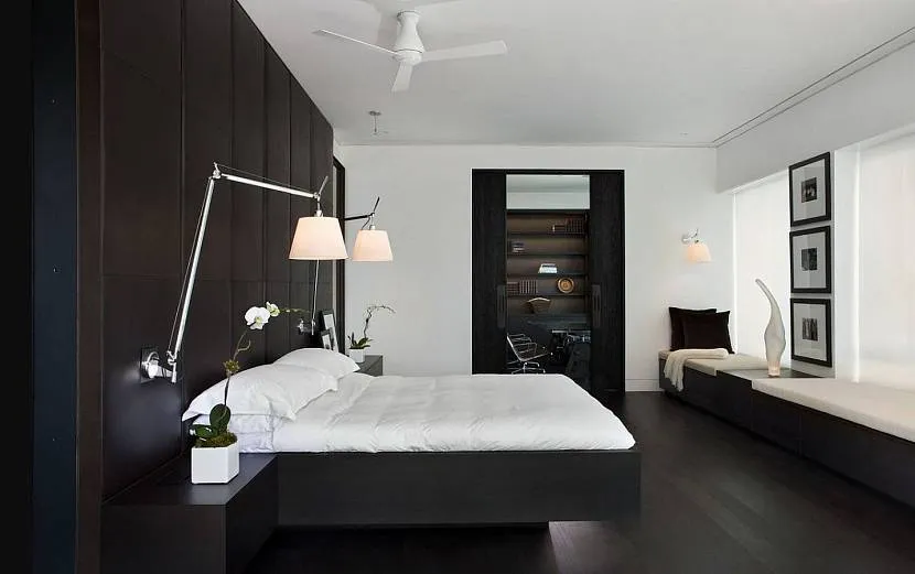 Много предметов интерьера перегружают пространство комнаты. Чтобы двухцветный дизайн выглядел уютным, используют минимум компонентов. Для спальни в черных тонах подходит белая мебель. Фасады шкафов, тумбочки и кровать станут ярким акцентом в оформлении. Игра матовых и глянцевых поверхностей поможет привнести настроение в помещение.