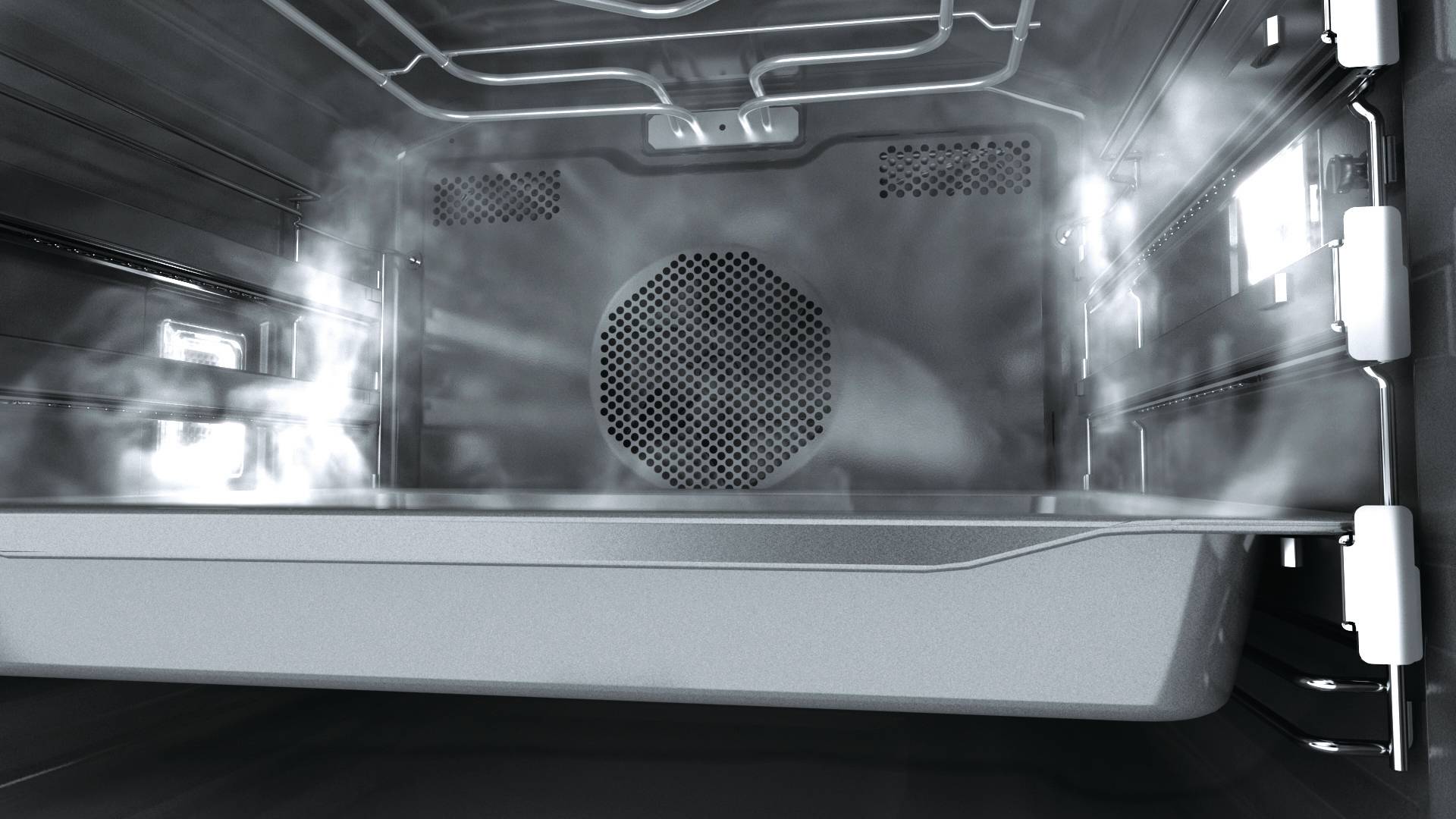 Стеклянный прозрачный фасад и двойная подсветка позволяют следить за процессом приготовления, не снижая температуру внутри. Съемные проволочные направляющие помогают доставать противень и не обжигать руки. Духовка оснащена электрическим грилем и вертелом с электроприводом, переворачивать пищу вручную не придется.