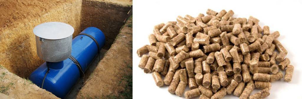 Слева — газгольдер, который заправляется СУГ; справа — пеллеты