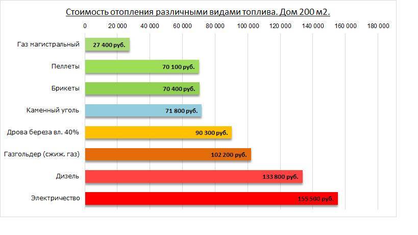 Сравнение стоимости отапливания дома разными видами топлива (реальные цифры могут отличаться)