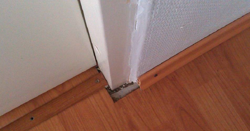 Дверные косяки, не опирающиеся на пол, могут просто не выдержать тако нагрузки. Они будут крепиться лишь на шурупы к стенам и при частом использовании их «поведет». Можно увеличить количество креплений, но это будет выглядеть некрасиво. Поэтому в таком случае лучше настелить покрытие после установки дверей. Тогда боковые планки коробки будут упираться в бетонную стяжку, что в сочетании с креплением к стенам создаст надежную конструкцию. Ламинированные панели, уложенные возле косяков, нужно будет подрезать по бокам, оставляя зазор между ними и дверью примерно в 1 см. Эту щель впоследствии можно закрыть плинтусом, но тут снова встает проблема с нагромождением его коротких отрезков.