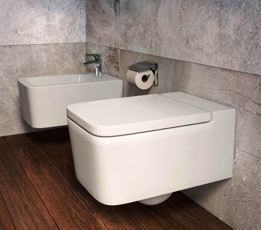 Подвесной унитаз. Устройство крепится к стене с помощью специальной инсталляции. Выдерживает до 400 кг веса. Его достоинства – компактность, облегчение процесса уборки, привлекательный внешний вид.