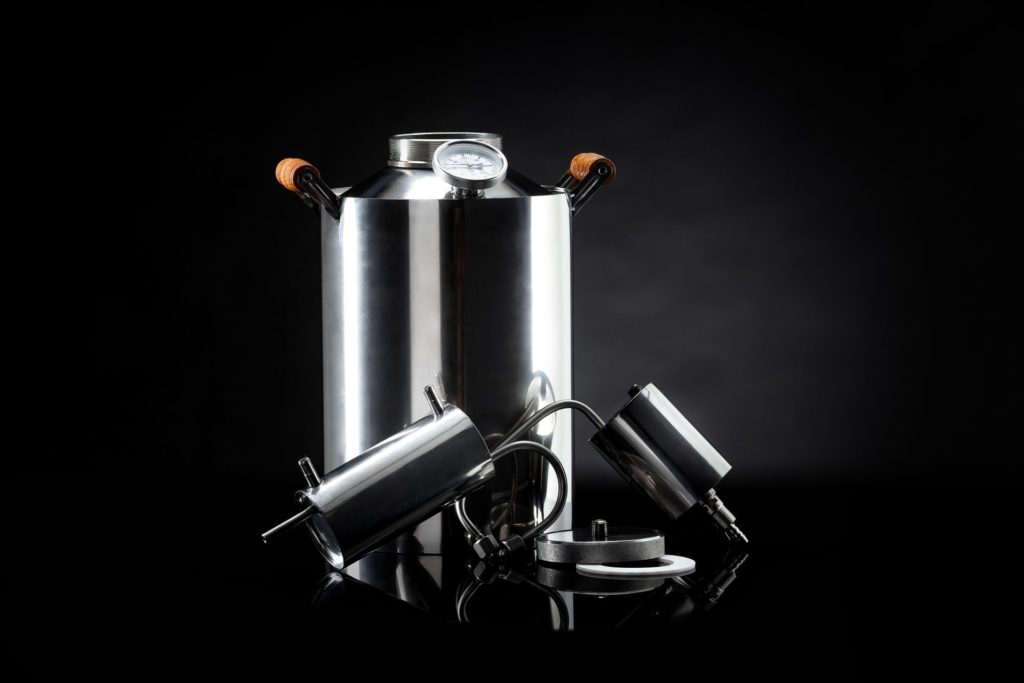 Среди современных моделей можно выделить в лучшую сторону данный вариант. Он представляет собой ёмкость для нагревания браги с прикрепленной к ней металлической трубкой. Трубка устанавливается поверх крышки и имеет вертикальное расположение с изогнутой формой. В элементе происходит ускоренная конденсация и выход спирта в ёмкость для сбора напитка.