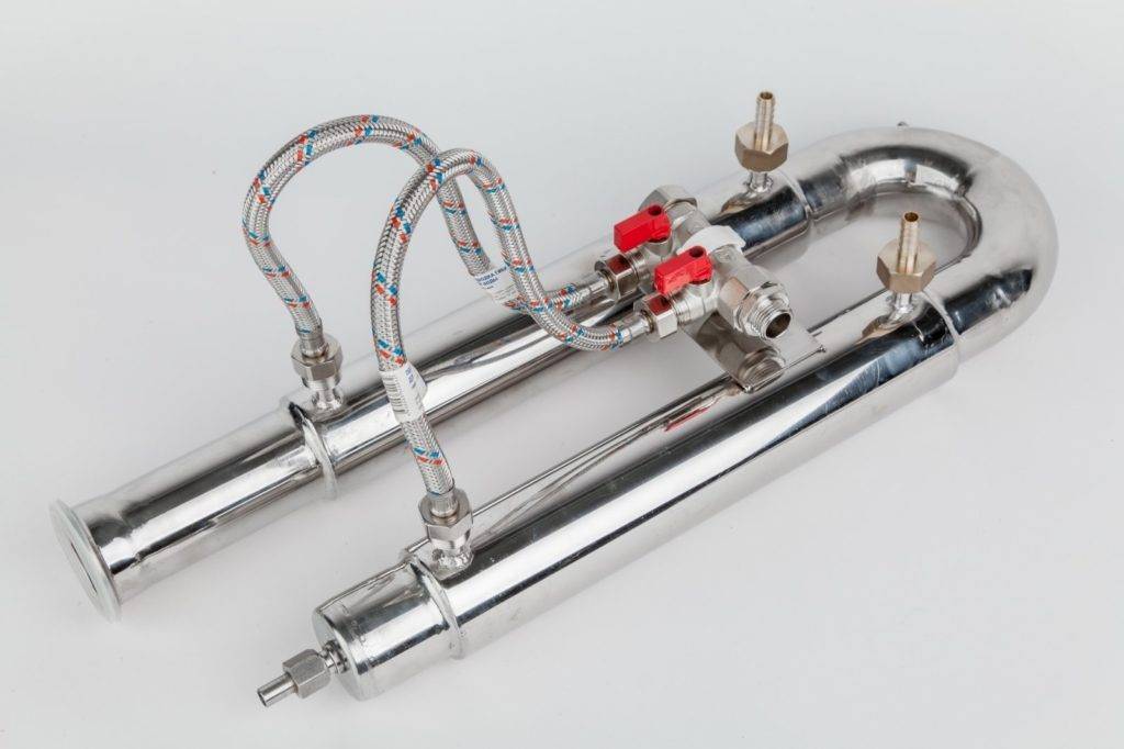- Холодильник под проточную воду: 5 витков змеевика длиной 1,5 м. Конструкция заключена в нержавеющий цилиндр высотой 20 см, шириной 9 см со штуцерами для подвода воды.