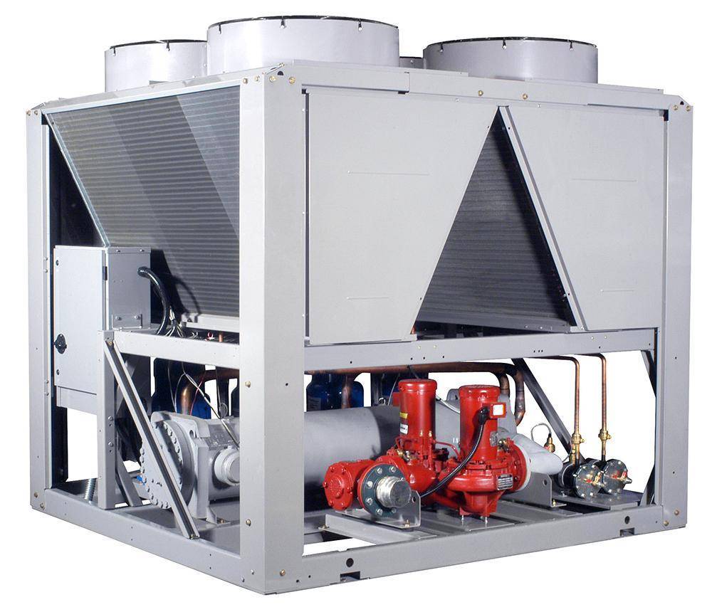 - Чиллер — механизм, расположенный на внешней стороне здания. Его работа заключается в передаче в окружающую среду тепла, отнятого у воды. Большая часть чиллеров способна нагревать воду в осенне-весенний период.