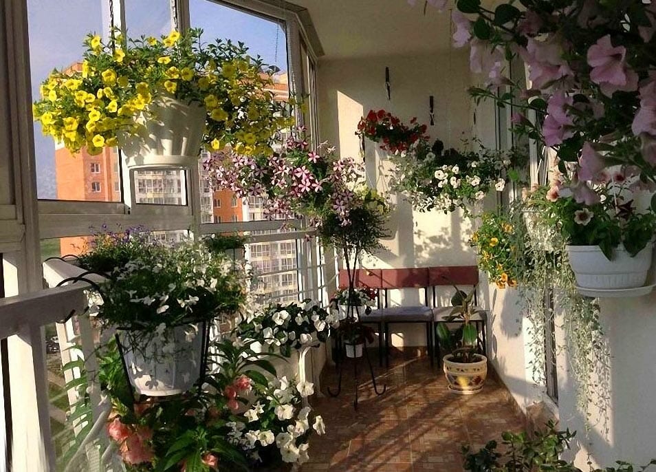 Цветы на лоджии в пластиковых контейнерах и в подвесных кашпо
