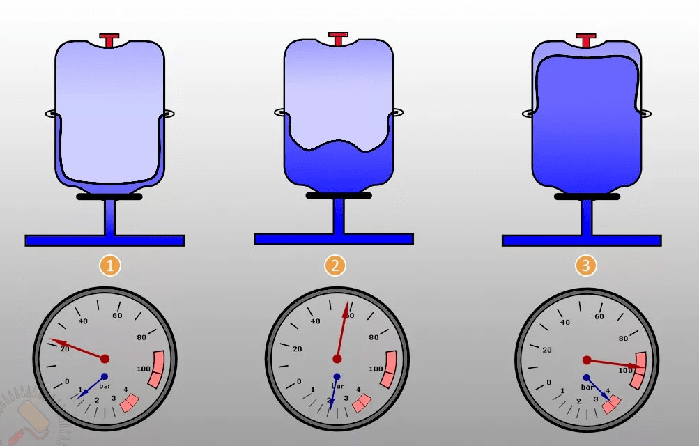 Четвертым узлом утечки может оказаться расширительный бак. В данном баке отсутствует воздух. В нем имеется мембрана, благодаря которой в одну сторону закачивается воздух, а во вторую идет давление с системы отопления.