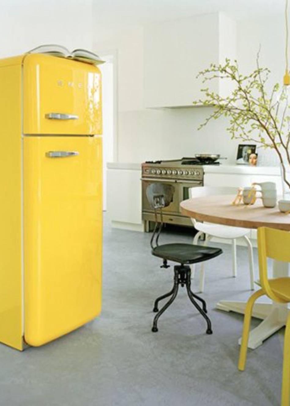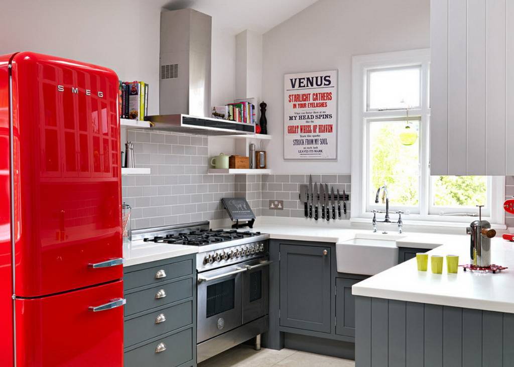 Холодильник с цветными дверями должен выбираться для кухни в последнюю очередь тогда, когда все работы по дизайну уже завершены, иначе есть риск получить слишком яркое пятно, которое будет перетягивать на себя все внимание или, наоборот, “серую дыру”, нарушающую гармонию созданного пространства.