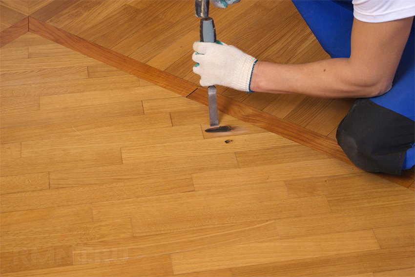 - Аккуратно разберите пол и пронумеруйте ламели, чтобы не запутаться при повторной их укладке. Половицы с «разбитыми» замками замените новыми.