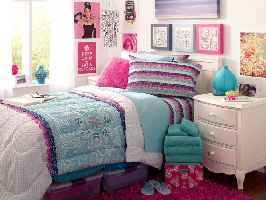 - для девочек выбираются более нежные оттенки: розовый, бирюзовый, салатовый. Над кроватью можно повесить полупрозрачный балдахин, на полках расставить мягкие игрушки и кукол, на кровати разложить красочные подушки.