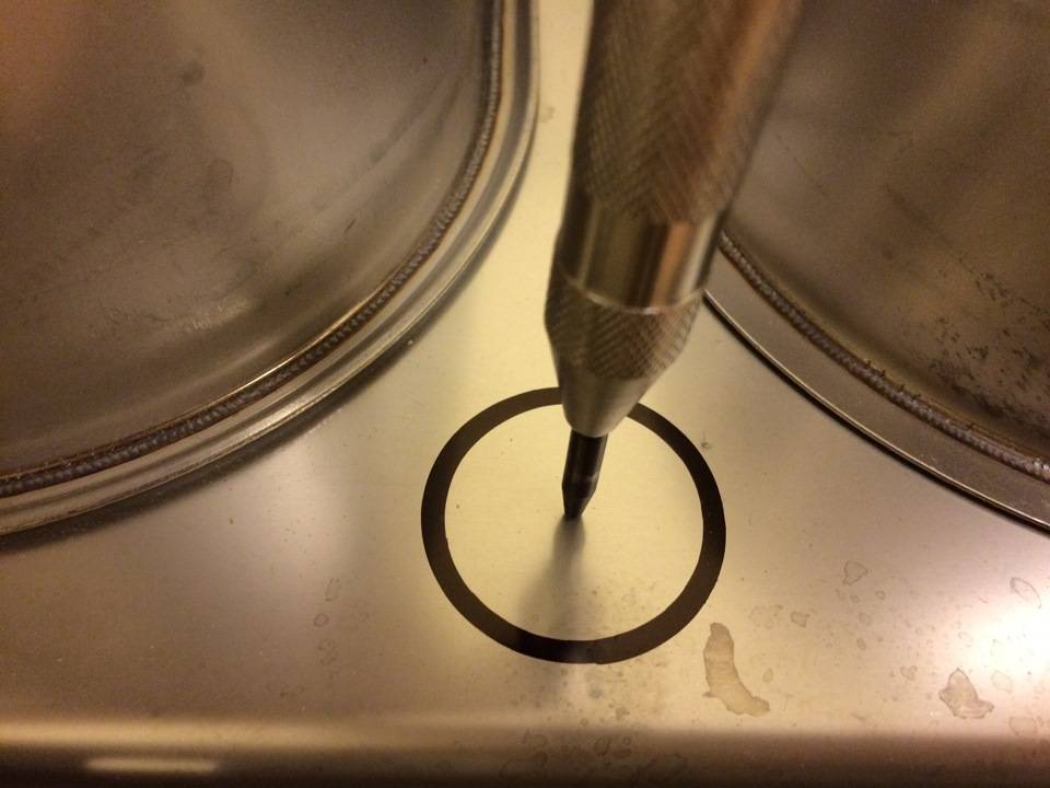 Далее нужно найти центр круга и автоматическим или обычным кернером сделать небольшую вмятину, иначе сверло может соскочить и отверстие не получится точно в центре: