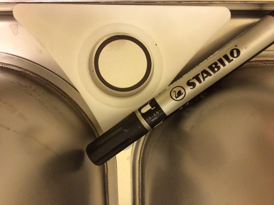 В моем примере он встает под раковину единственно возможным образом, ставим, маркером обводим круг: