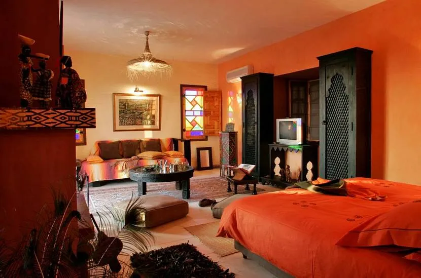 Мексиканский дизайн приветствует насыщенные красные, синие, зеленые оттенки. Марокканский же предпочитает сочетание позолоты с белым цветом и древесиной. Персик в таком интерьере выступает как связующее звено, делающее комнату гармоничной.