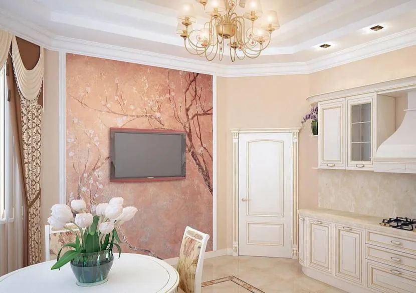 Современная классическая кухня с персиковыми стенами, роскошной люстрой, драпированными шторами, создают гармоничный интерьер.