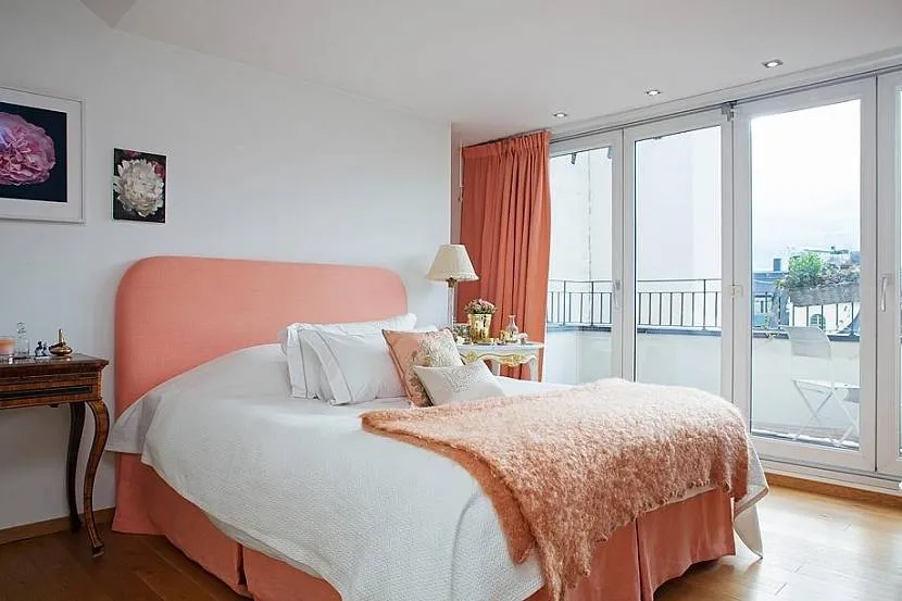 Интерьер персиковой спальни в скандинавском стилеИсточник homeli.ru